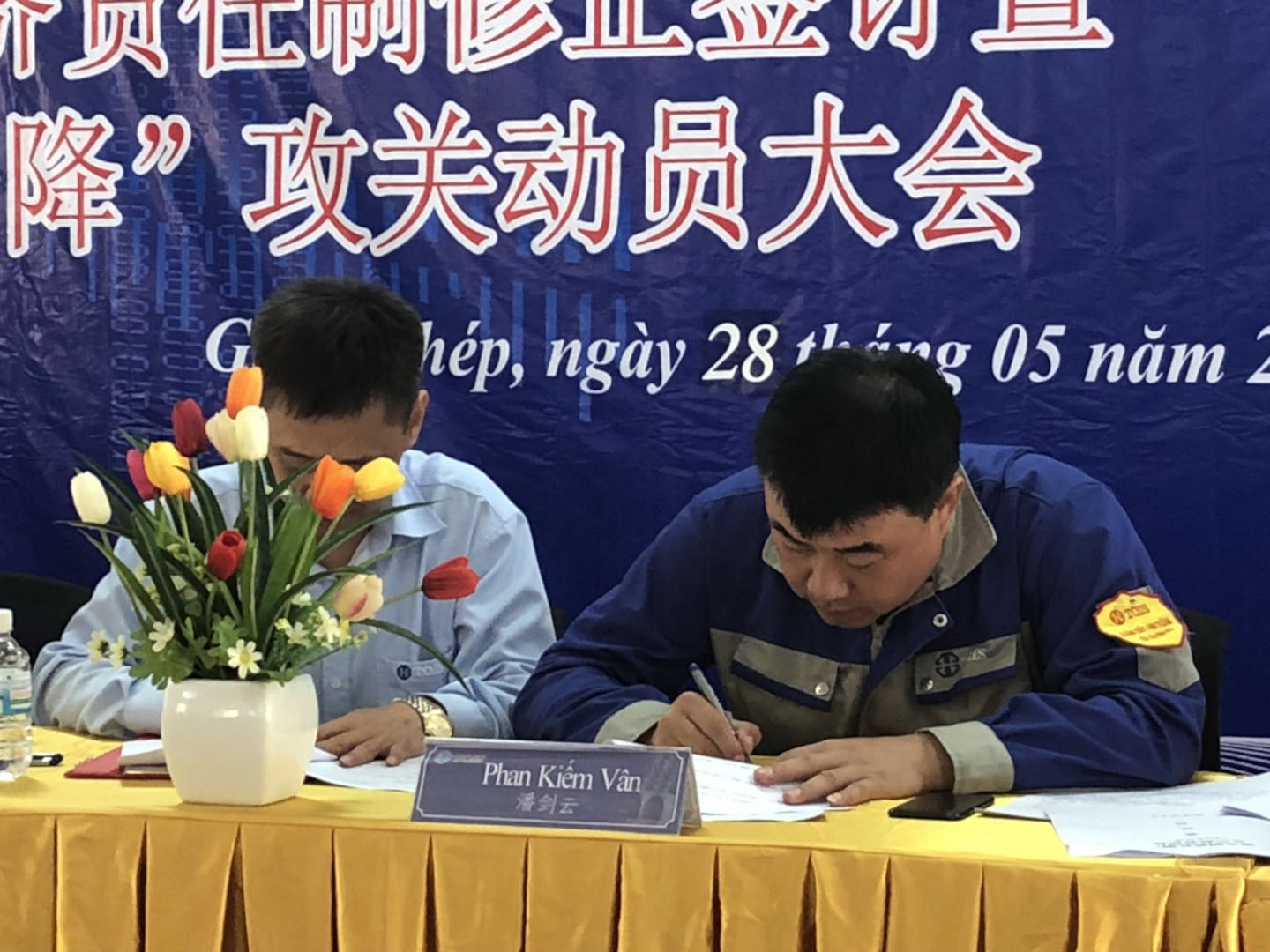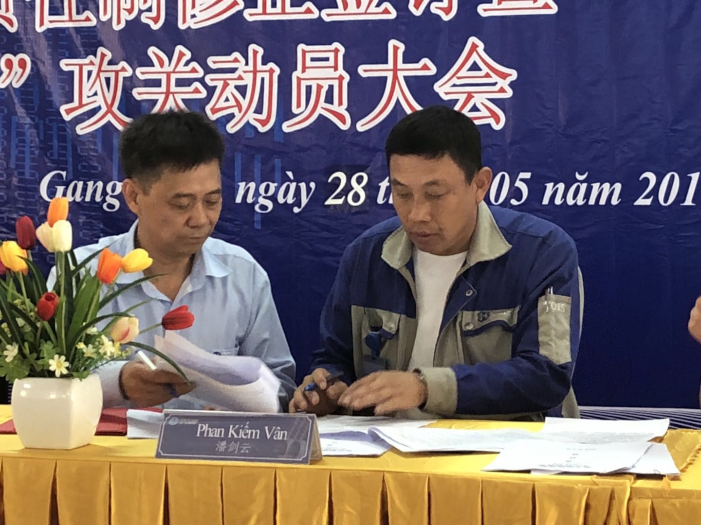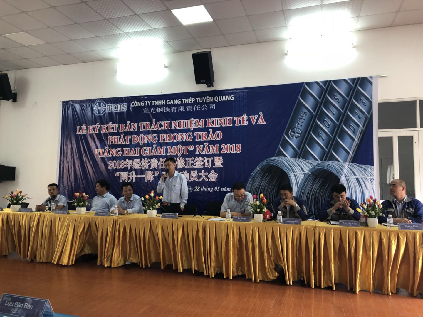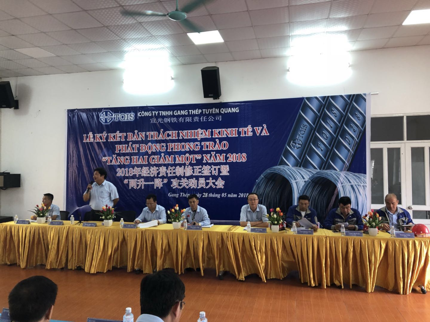 2018年5月28日上午9点(越南时间),,,,越南宣钢公司召开了目的责任书签署暨两升一降公关发动大会。。。。本次聚会是凭证柯希平董事长提出的“两升一降”指导目的所召开,,,,希望通过签署目的责任书调发动工起劲性、团结全体员工,,,,抵达“提升企业效益、提升员工收入、降低公司本钱”的目的。。。。