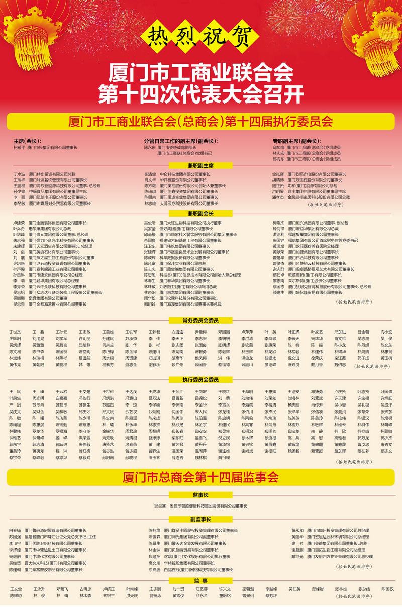 聚会选举爆发厦门市工商业联合会(总商会)第十四届执行委员会、厦门市总商会第十四届监事会组成职员,,九游电竞集团董事长柯希平连任主席(会长),,奥佳华集团董事长邹剑寒中选监事长。。。。。